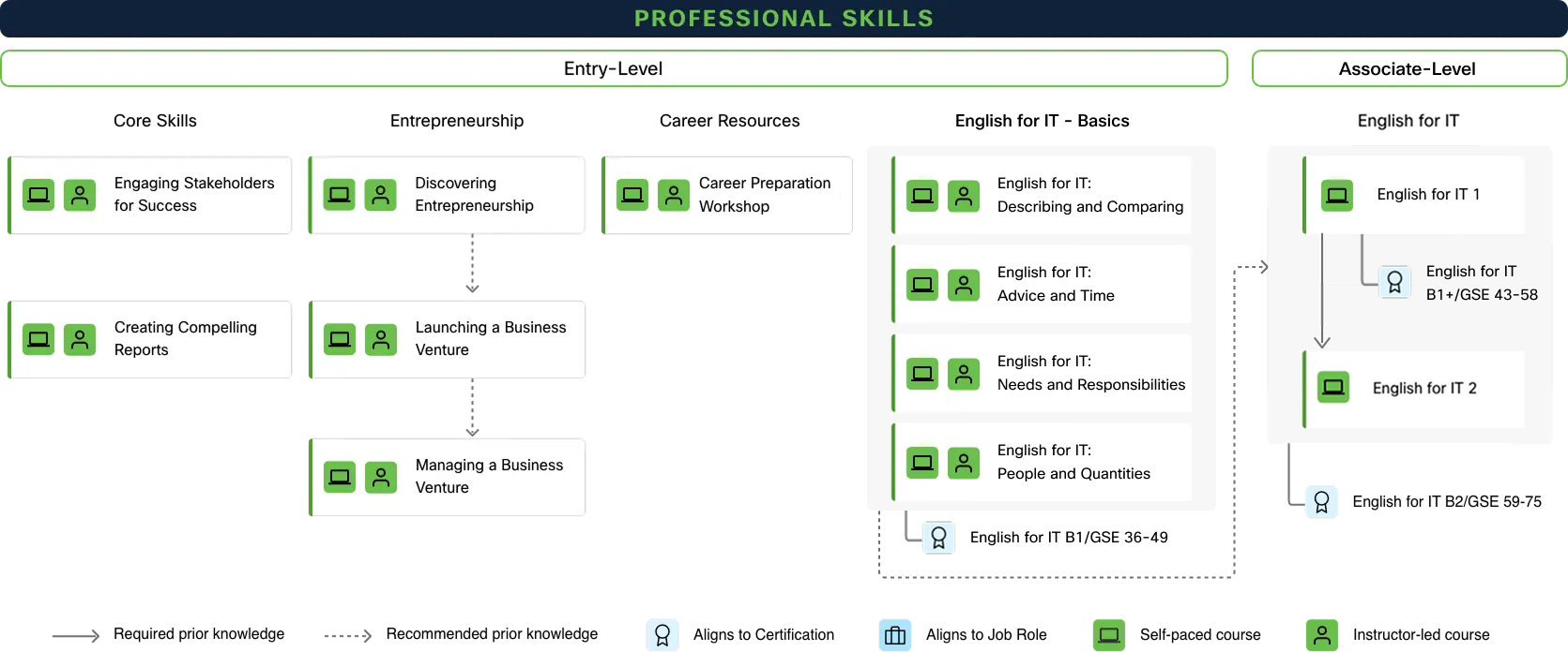 Başlanğıc səviyyədən (A2) orta səviyyəyə (B1) yüksəlmək üçün dörd kursu tamamlayın. Upper-intermediate (B2) səviyyəyə çatmaq və “English for IT B2 GSE 59–75″ sertifikat imtahanına hazırlaşmaq üçün “İt üçün İngilis Dili 1 və 2” kursları ilə davam edin.
