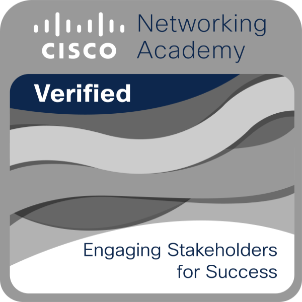Cisco nəyi təsdiqləyir: Cisco təsdiq edir ki, nişan sahibi “Engaging Stakeholders for Success” kursunu müvəffəqiyyətlə bitirmişdir. Bu etimadnamənin sahibi maraqlı tərəflərin müəyyən edilməsi, təsnifatı və analizi üzrə təməl bacarıqlara malikdir və peşəkar layihə mühitində aktiv dinləmə, müsahibə texnikaları və etimad qurma strategiyalarını tətbiq edə bilir.